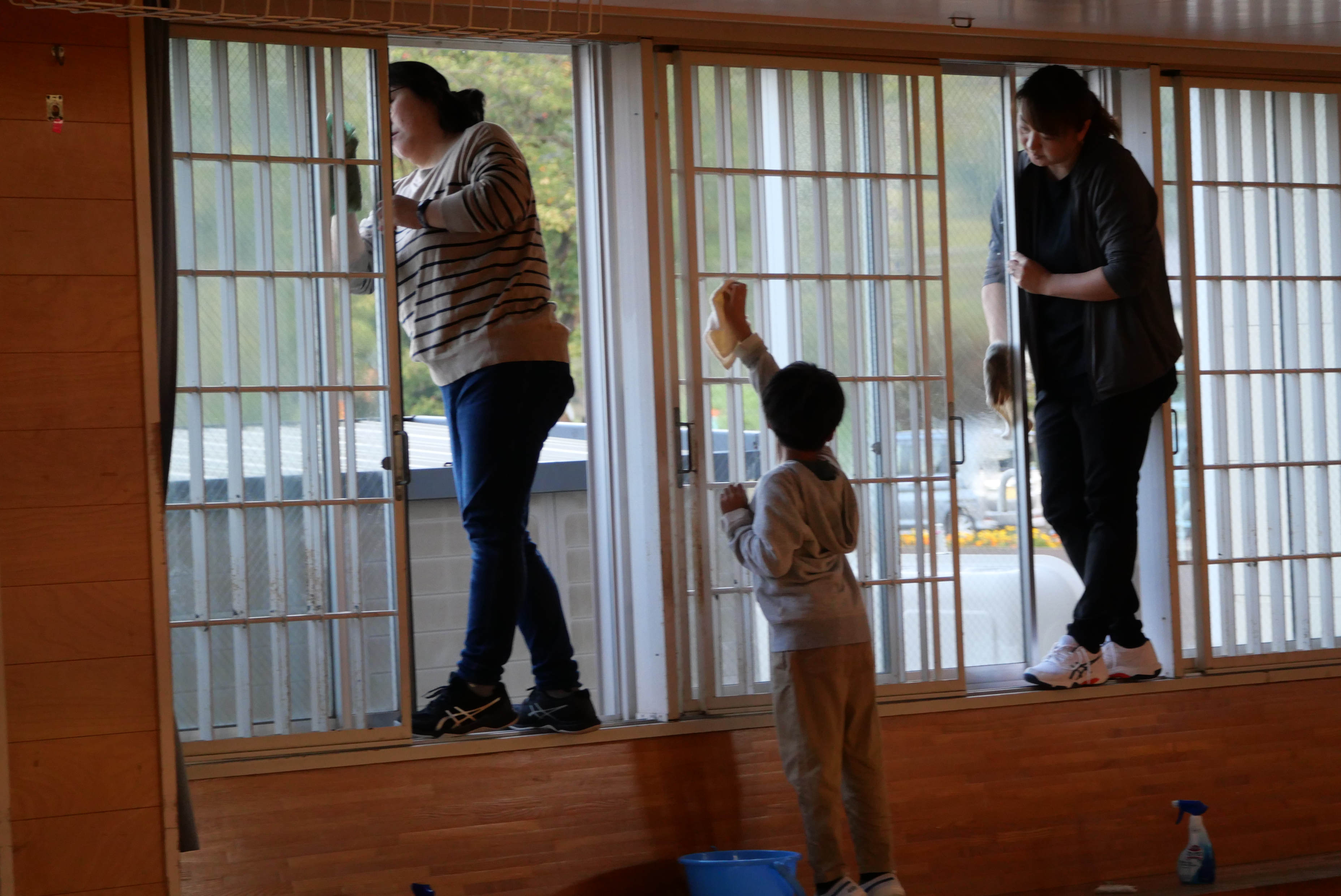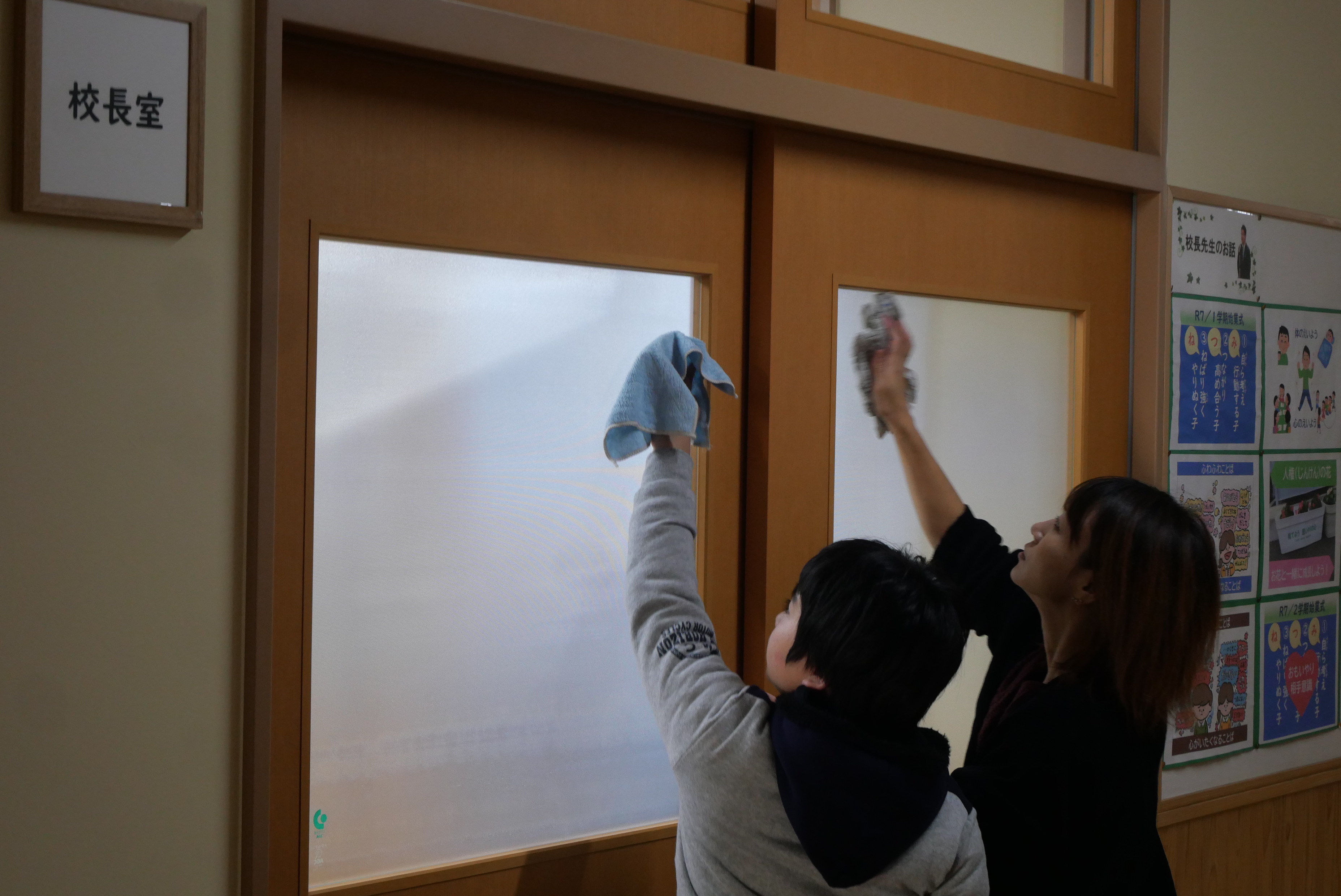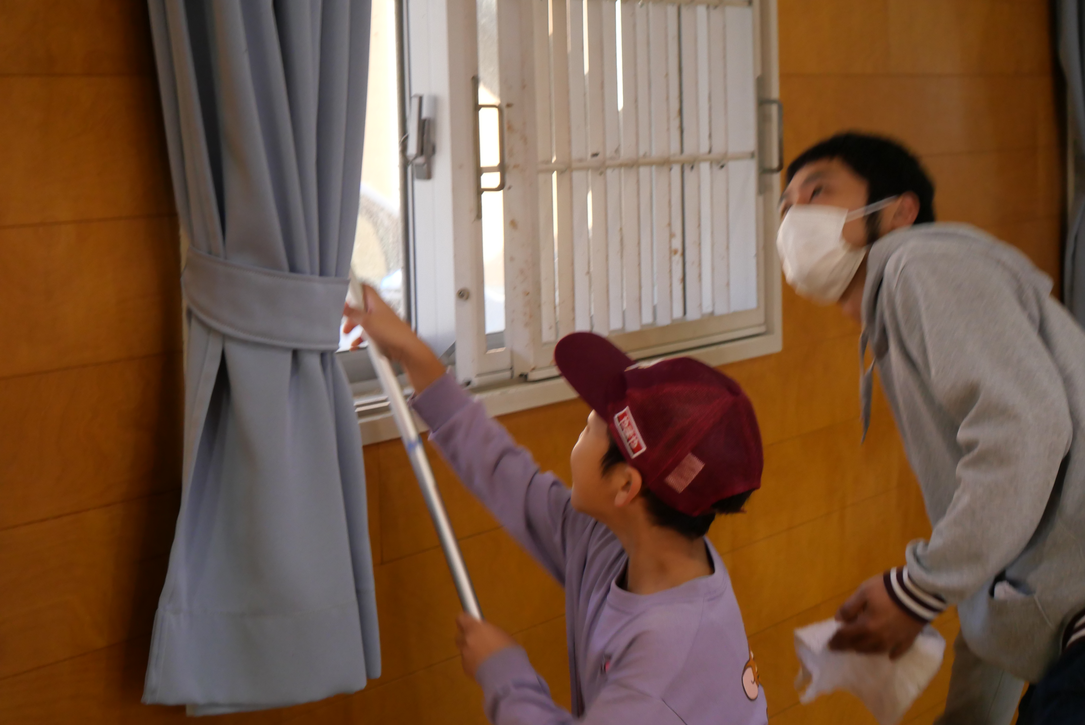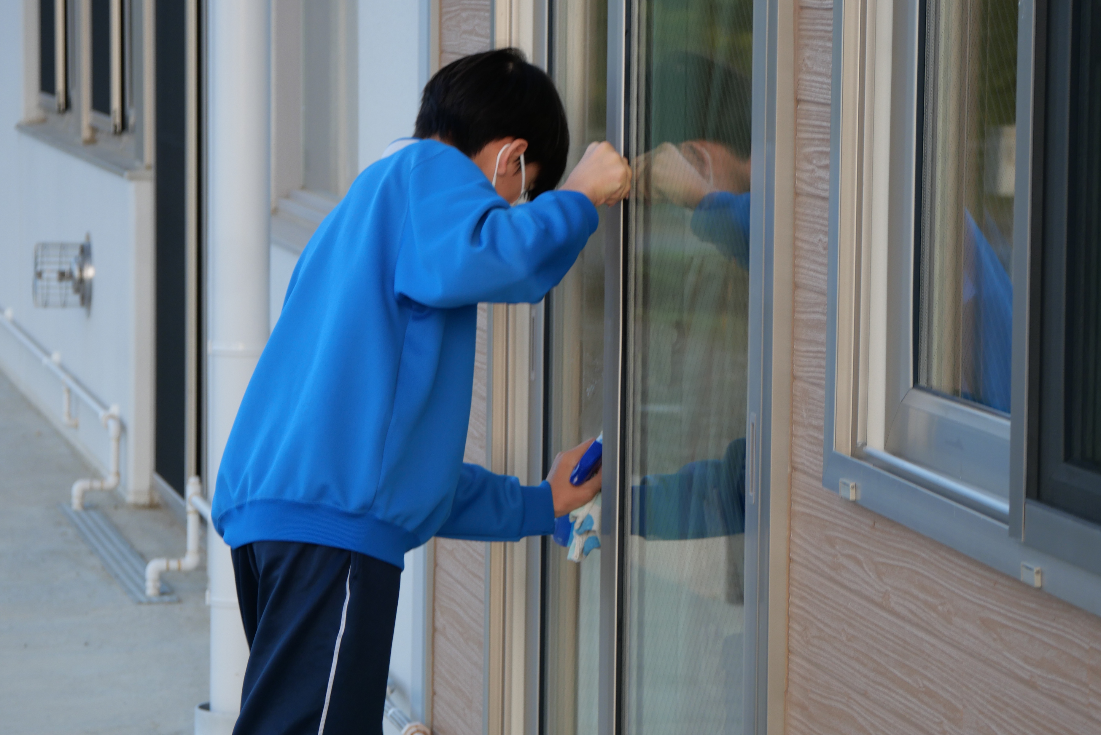 今回は、窓掃除が中心で、窓ガラスや窓の桟をきれいにしていただきました。普段届かない高いところまで、とてもきれいにしていただきました。この環境整備作業に参加してくれた小学生や中学生も、おうちの方の姿に影響を受け、いつも以上に熱心に掃除してくれていたと思います。